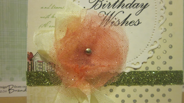 I made the flower with some tool that I received as gift wrap. I cut into circle and burned the edges. I put the flower together with a brad. I wanted to put a pearl in the center, but the brad was the quickest way to attach all the layers.